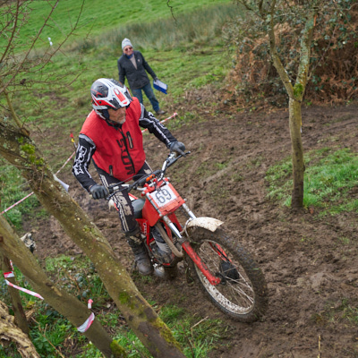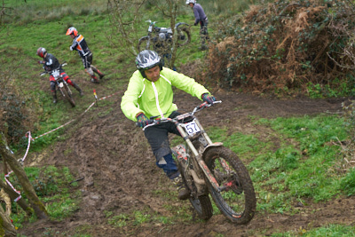 The very popular Middle / Easy route was not as easy as it looked but Mark Davidson 250 Evo was on the case today with a fine win losing 35 marks. Mark, as were many finding grip a tad difficult on the eighty yard muddy climb of section six with in the end the correct choice of line essential to conquer the hazard. In second spot Chris Aylott persuaded the WR 250 DOT around for a further 5 marks, Chris was excellent at section eight a sweeping climb up a wooded hillside before turning on a lattice of roots then a slick downhill camber to the ends.